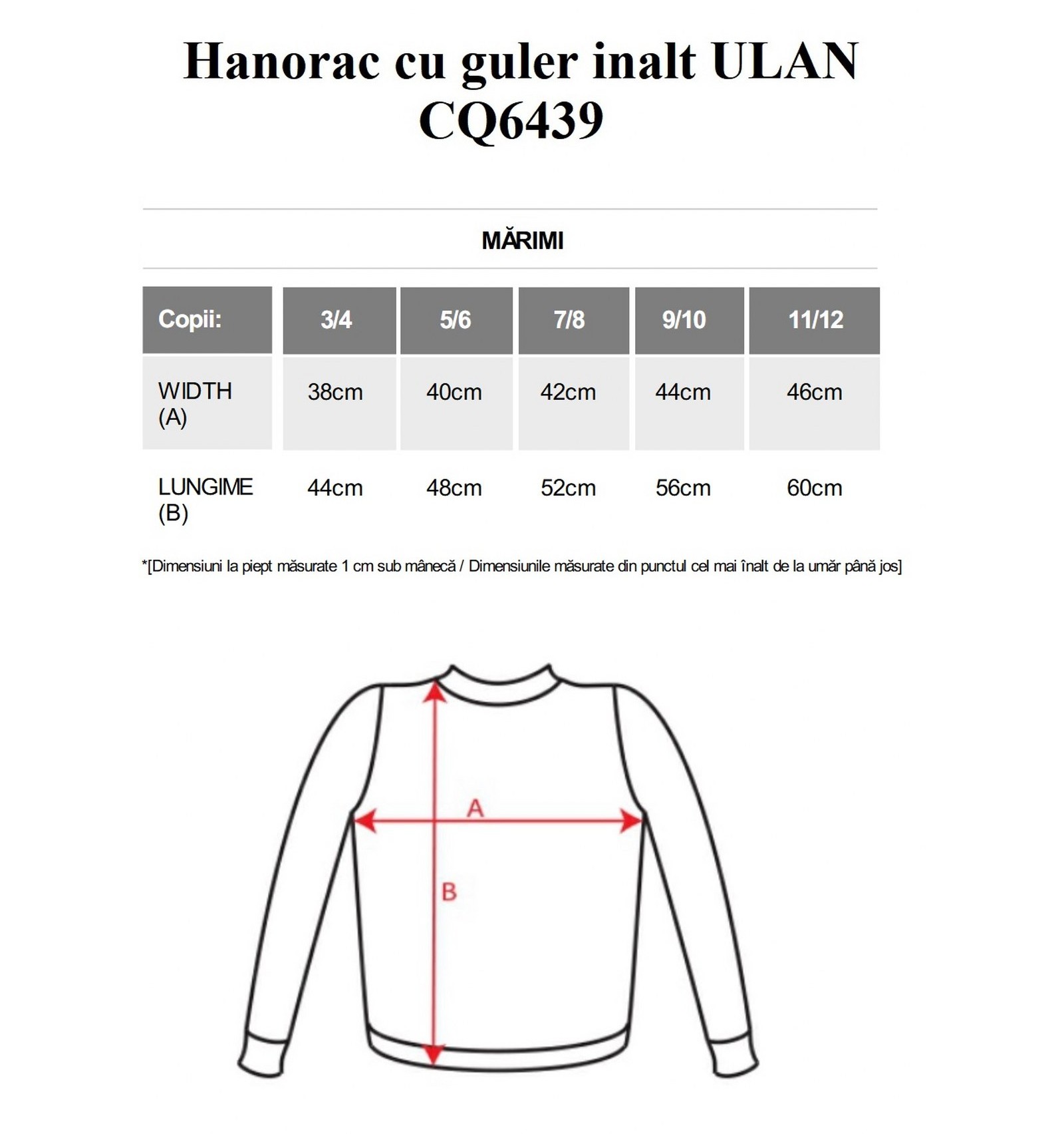 Hanorac cu guler înalt și fermoar la gât de aceeași culoare. Interior guler de aceeași culoare. Bandă întărită pentru acoperirea cusăturii pe interior la guler. Punct canalé 1x1 la manșete și în talie.