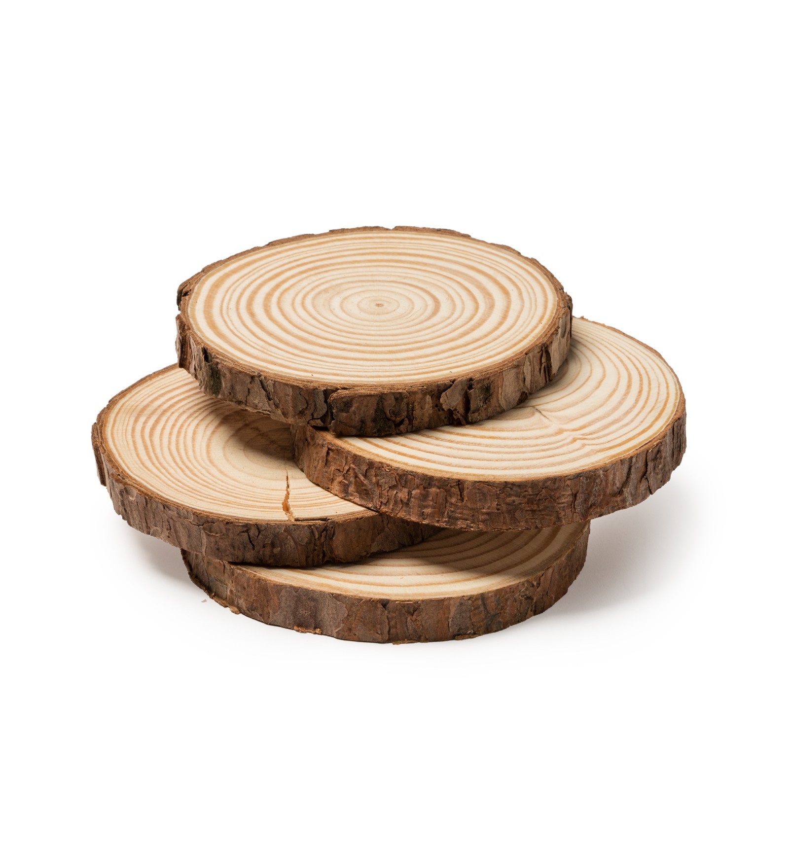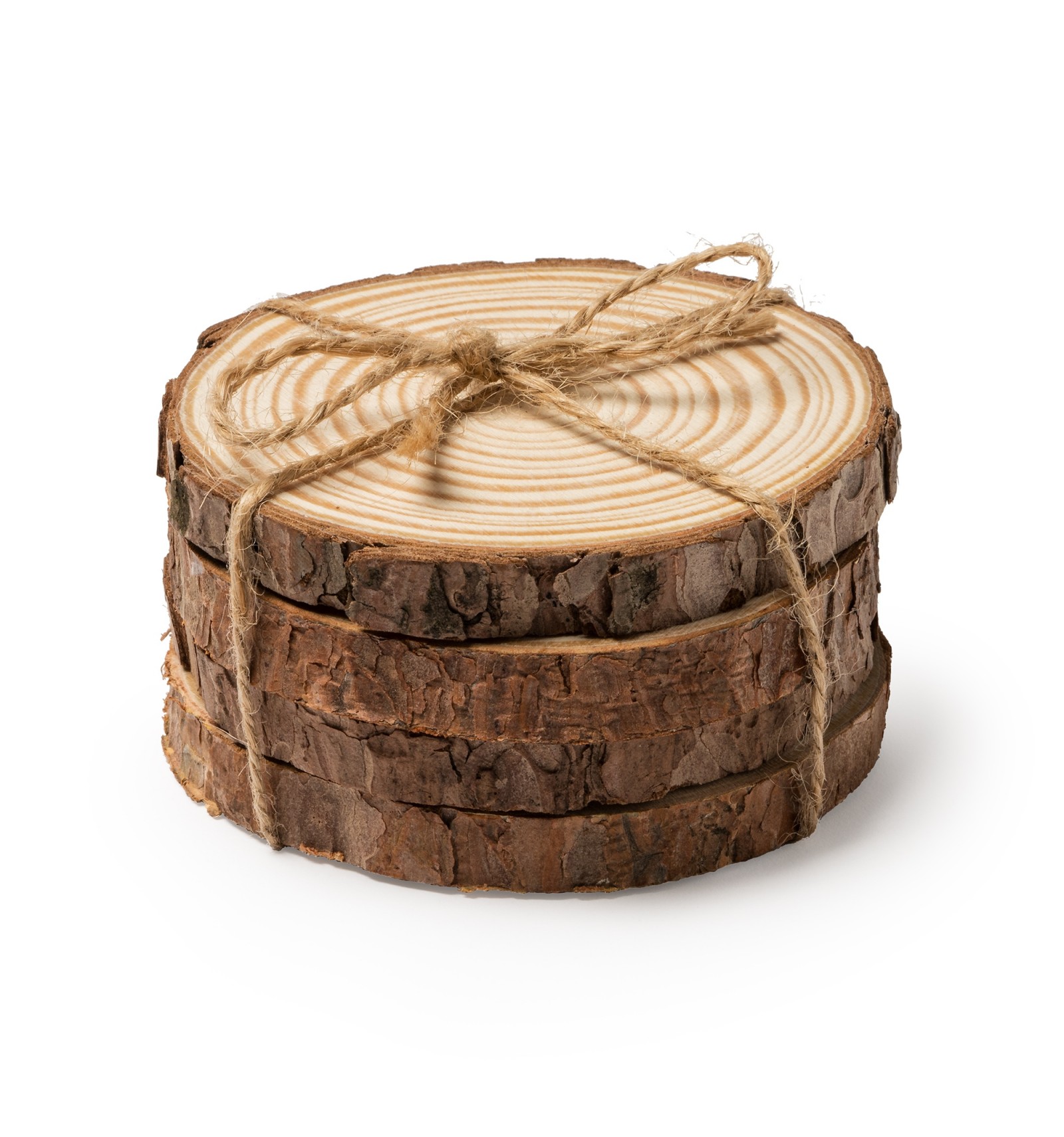 Set de patru suporturi pentru pahare din lemn natural de pin legate cu un cordon din iută naturală.