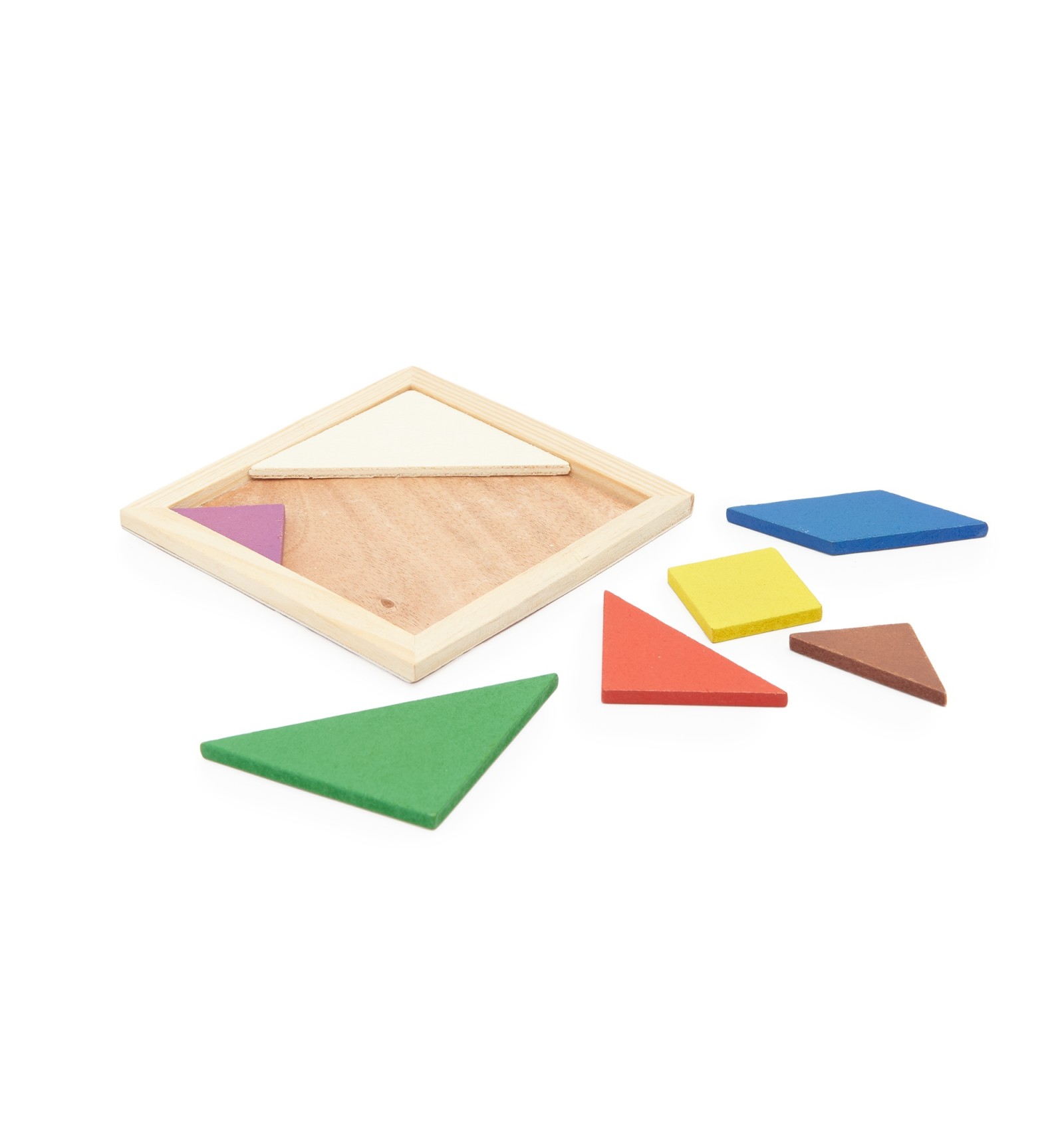 Puzzle Tangram din lemn natural cu 7 piese colorate. Ideal pentru dezvoltarea abilităților.