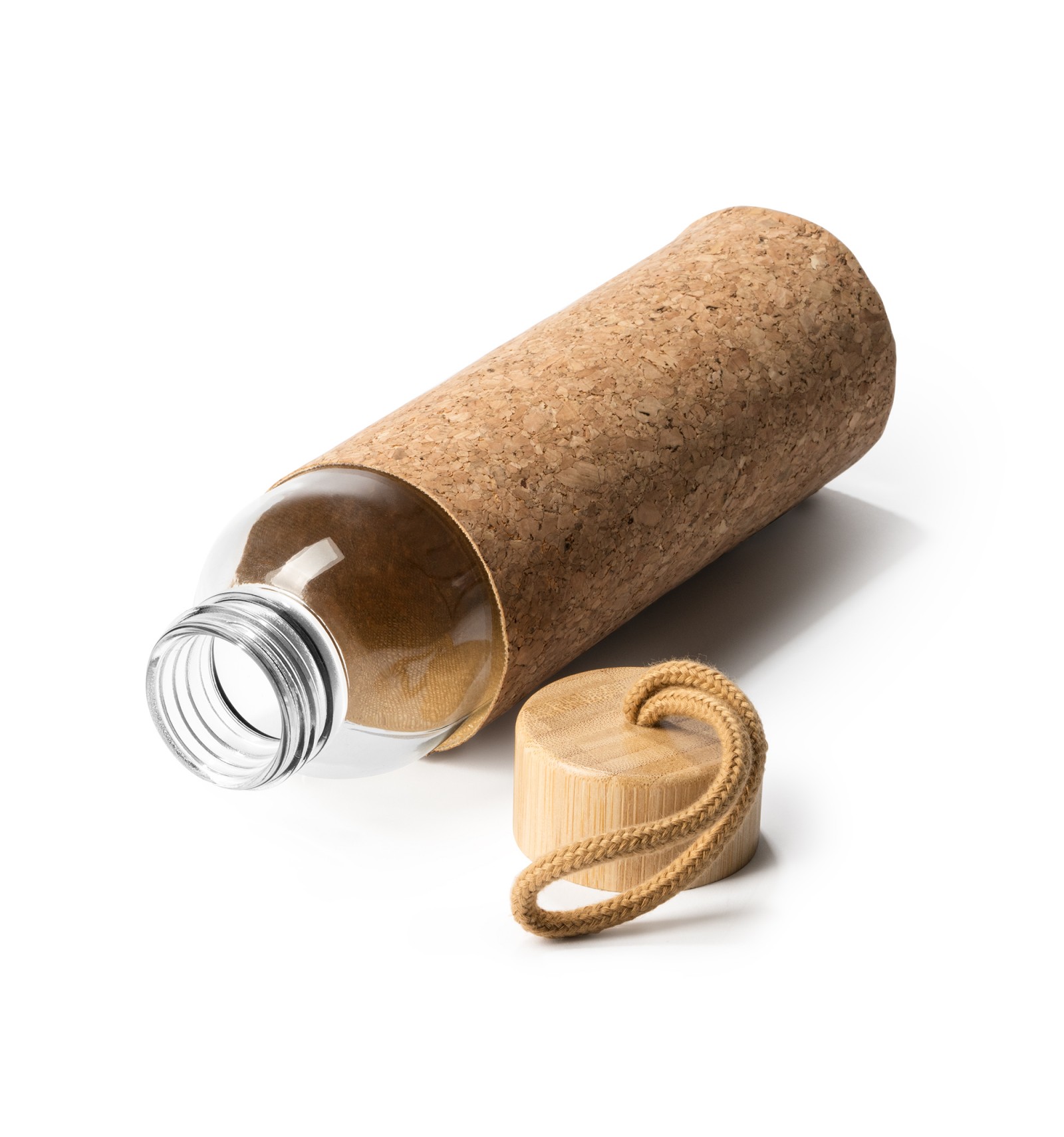 Sticlă cu săculeț din plută naturală. Capac din bambus și snur practic pentru transport. Capacitate de 500 ml.