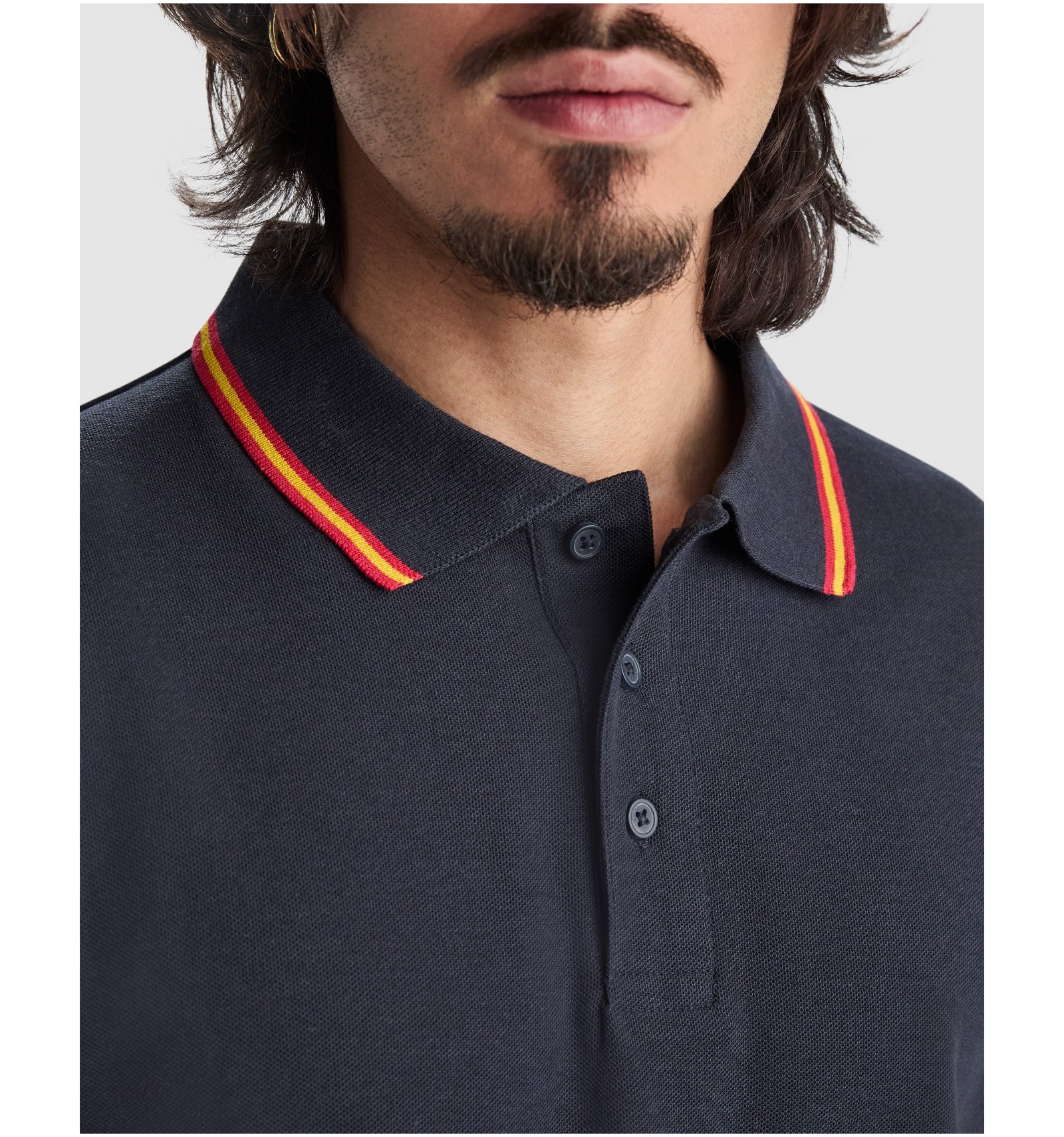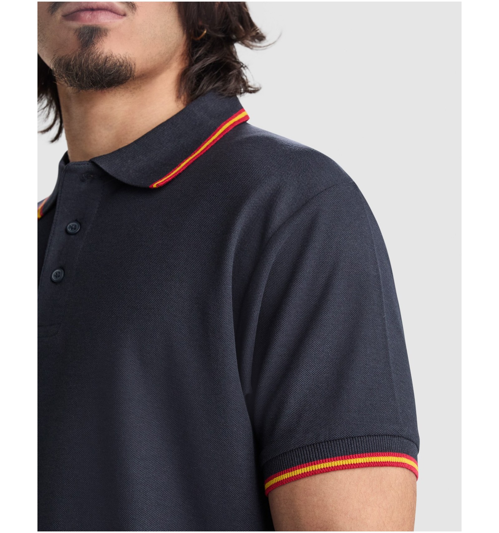 Tricou polo cu mânecă scurtă. Guler și manșete jackard cu tapetă cu trei nasturi. Bandă întărită pentru acoperirea cusăturilor la guler. Ornamental steag brodat la spate.